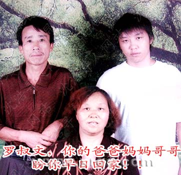 罗叔文,男,1987年12月31日出生,湖南桂阳县敖泉乡咸宜村委荷叶塘二组人,身高1.60米左右,体形正常,圆脸,双眼皮,牙齿整齐,小手指有弯曲,肤色偏黑,头发黑密,郴州口音,说话欠流利,性格内向,不爱与人交流,会玩电脑游戏。于2009年10月3日(阴历八月十五)晚上在湖南省郴州市白鹿洞九组一带失踪。失踪原因不明,可能去向不明,失踪时,身上未带身份证。现家人在焦急寻找中,恳请各地公安、民政机关及好心朋友留心此则寻人启事,如有知情者,请与下列联系人联系,家人感激不尽。如罗叔文本人见此寻人启事,请速回家。